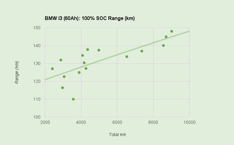 Was also tun? Man kann sich über die maximal zu ladende Energie sowie die die maximale Reichweite dem Thema annähern. Maximal heißt in diesem Zusammenhang die zum Laden von 0-100% SOC benötigten kWh sowie die Reichweite, die ich mit 100-0% SOC erreiche. Da insbesondere die maximale Reichweite aber unter starkem Einfluss von Sommer und Winter sowie der Fahrweise steht, benötigt man viele Messungen um eine statistisch signifikante Aussage zu gewinnen.