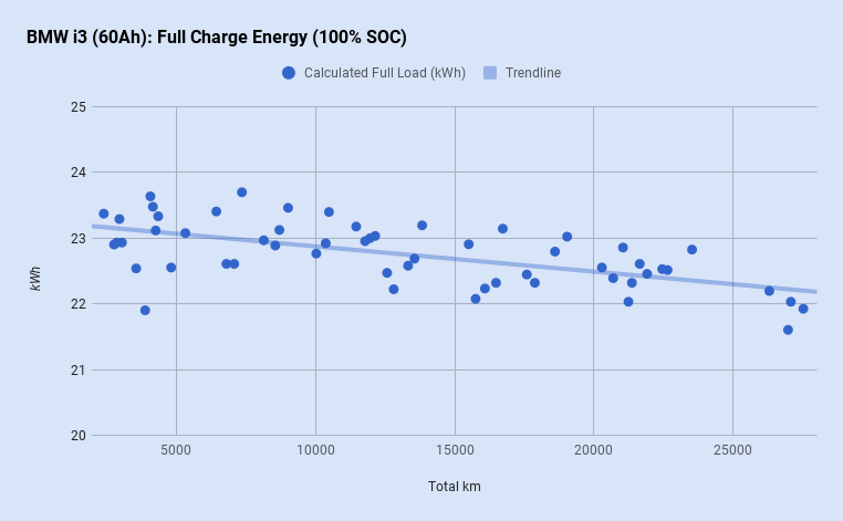 Wie die Abbildung zeigt, gibt es jetzt doch deutlich sichtbare Verluste bei der maximal zu ladenden Energie; während diese anfänglich noch um die 23kWh pendelte, sind jetzt meist nur noch 22kWh für eine 100%-Ladung vonnöten. Und Energie, die man nicht in die Batterie bekommt, kann man auch nicht verfahren ... Zwar muss angemerkt werden, dass das Messgerät zwischenzeitlich wegen Defektes gewechselt wurde, aber der glatte, kontinuierliche Abfall der Messwerte spricht nicht für einen Messfehler (dieser sollte typisch < 1% sein), sondern lässt tatsächlich einen Verfall der Batterie vermuten.