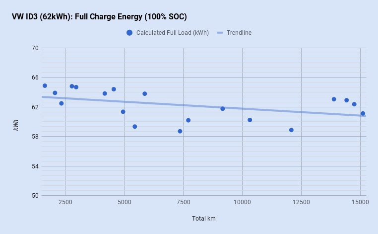 Nach nun 15000km und ca. 1,5 Jahren haben sich die ersten Messwerte angesammelt, um erste Näherungen des Degradationsverhaltens der Batterie des ID.3 zu ermitteln. Es ergeben sich ca. 3% Verlust nach 15.000km und den ersten 18 Monaten. Die Werte sind natürlich noch mit Vorsicht zu genießen, da es zunächst wenige Messwerte sind und auch die Verteilung dieser Werte über verschiedene Temperatur-Perioden noch nicht gleichmäßig ist (zwei mal Winter einmal Sommer enthalten).